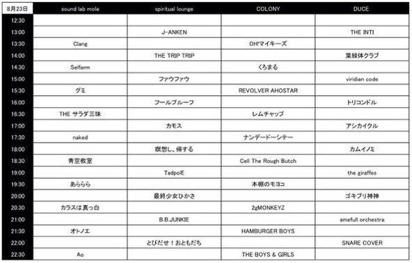 トリコンドル / SNARE COVER / ame full orchestra / アシカイクル / カムイノミ / 葉緑体クラブ / ゴキブリ神神 / the giraffes / viridian code / THE INTI / エディプスふたたび / (※Strange)gritty human / 真柴道ゐ / パレードパレード / Jake Stone Garage / comix / ザ・ノロノロズ / ザ・ゲルピンズ / 黄金クリムゾン / BAZRA / Transparent Blue / 月光グリーン / ブレエメン / CocoStretch / Vianka / Booooze / RAYZ / flooded floor / THE SERIOUS JOKES / ANSWER ERROR U / ネコライダー / trash audio / queueb / 桐嶋ノドカ / THE 武田組 / FANFIELDS / Selfarm / グミ / THEサラダ三昧 / naked / 青空教室 / あららら / カラスは真っ白 / オトノエ / Ao / J-ANKEN / THE TRIP TRIP / ファウファウ / フールプルーフ / KAMOS / 瞑想し、帰する。 / TadpolE / 最終少女ひかさ / B.B.JUNKIE / とびだせ!おともだち / OH!マイキーズ / くろまる / REVOLVER AHOSTAR / レムチャップ / ナンデードーシテー / Cell The Rough Butch / 本棚のモヨコ / 2gMONKEYZ / HAMBURGER BOYS / THE BOYS & GIRLS /