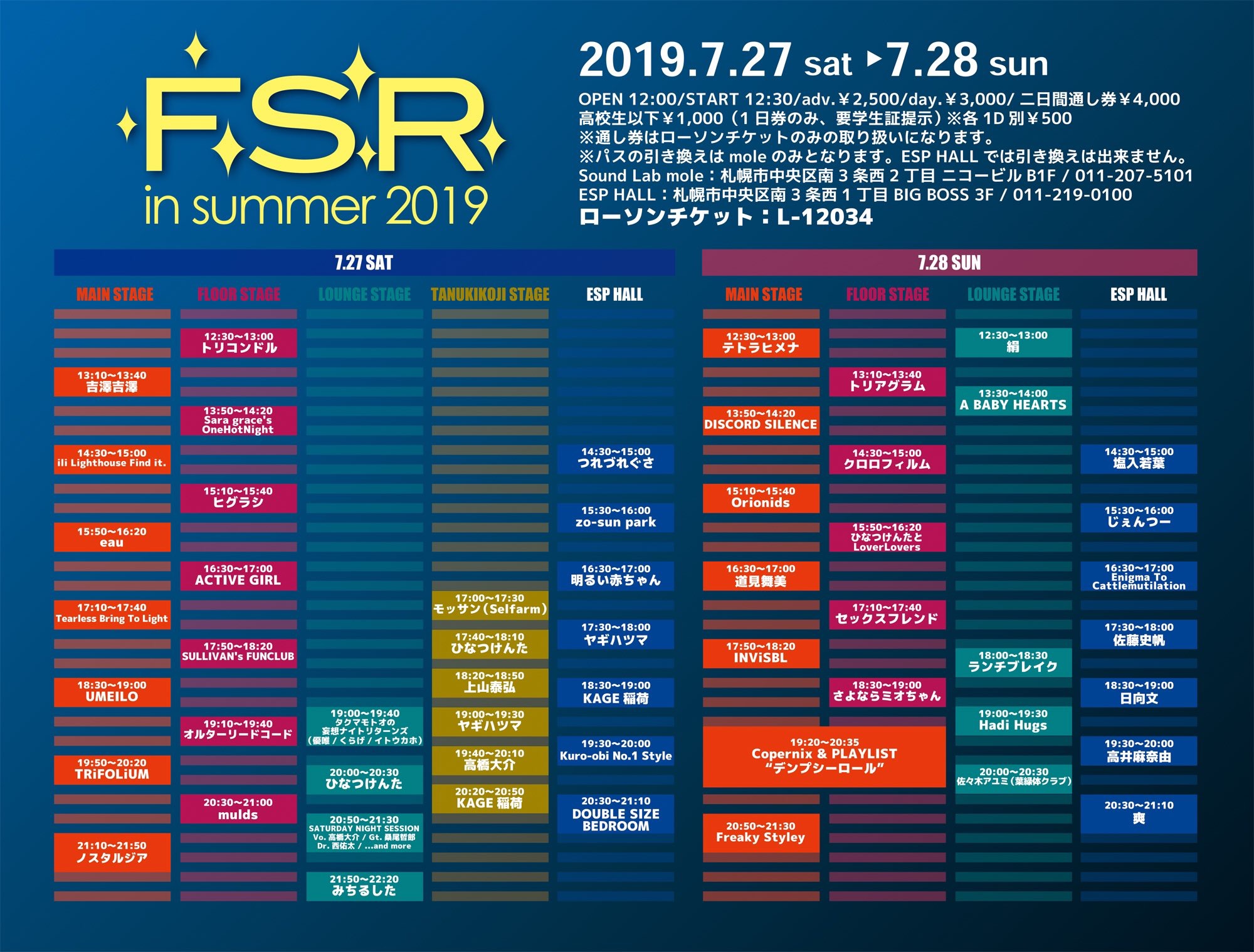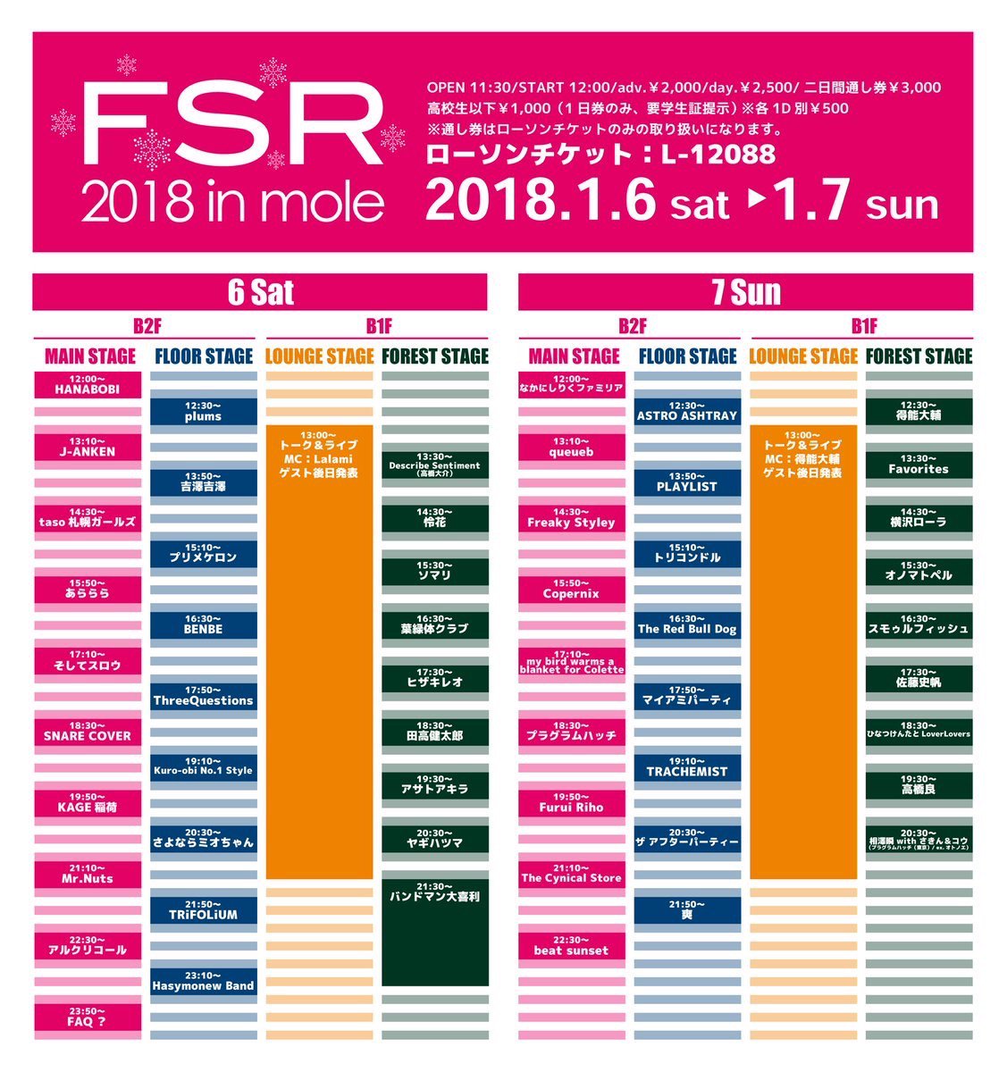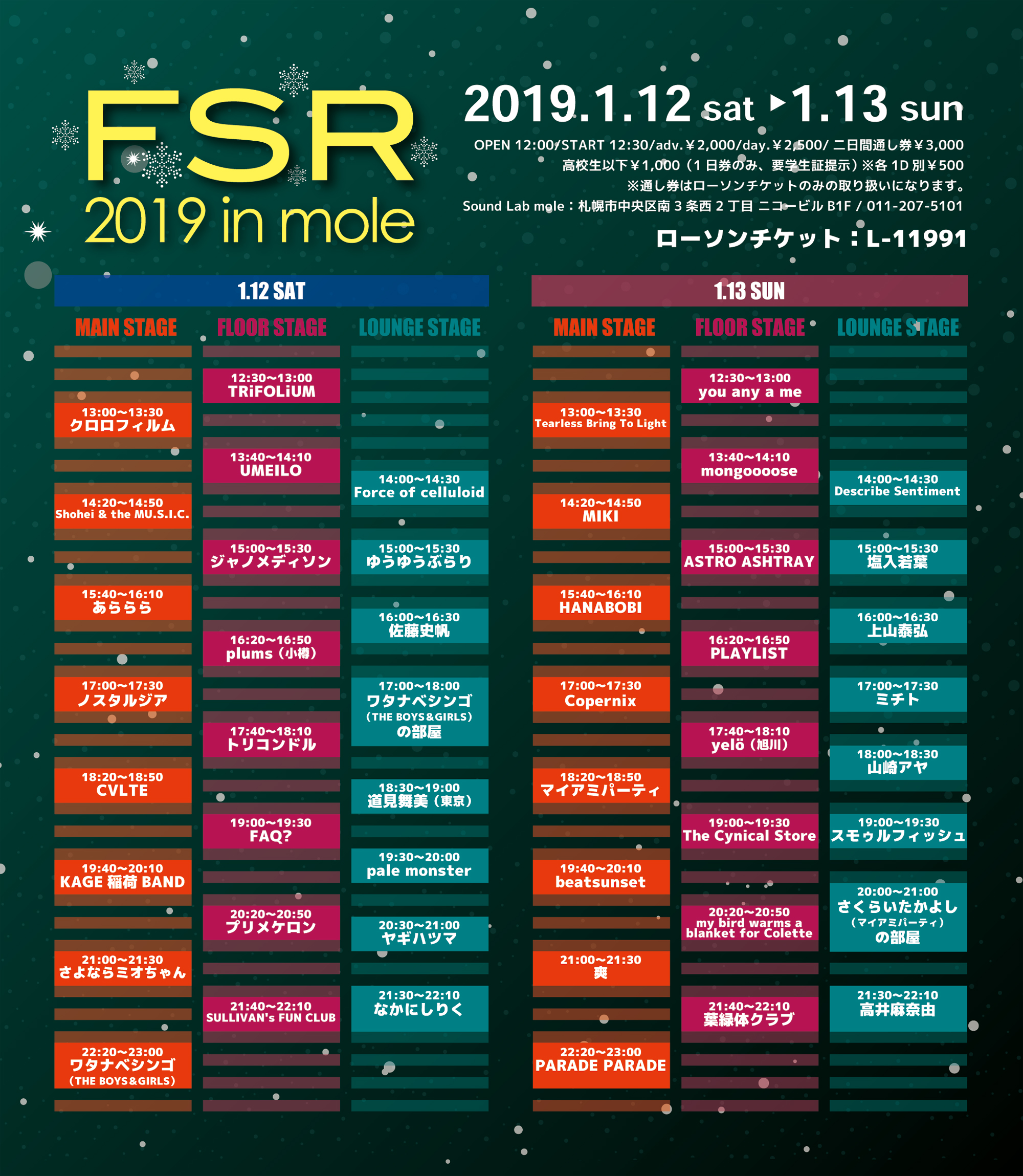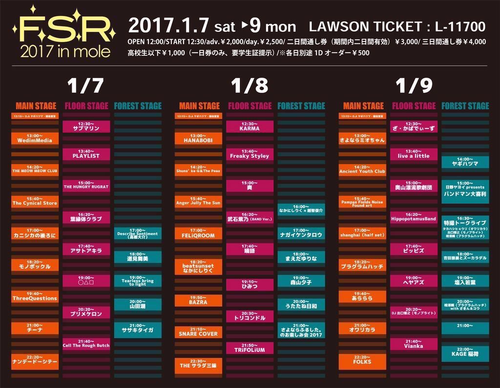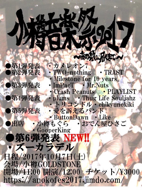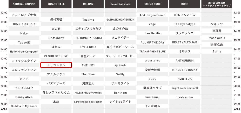 トリコンドル / THE BOYS & GIRLS / The Floor / あららら / グミ / 時空美月 / ヘヤアズ / 本棚のモヨコ / ame full orchestra / Anger Jully The Sun / bright color section3 / juvenile juvenile(大阪) / KAGE稲荷 / live a little / owtn. / teen core man core / THE HUNGRY RUGRAT / ThreeQuestions feat k:soul:y(東京) / YOU SAID SOMETHING / 青空教室 / 奏美 / 機動戦士YARANAIKA / 月光グリーン / 最終少女ひかさ / ザ・オネガイシマース / 疾走の理由 / スモゥルフィッシュ / 中尾諭介(In the Soup / 東京) / なかにしりく / なかにしりく × beatsunset / 林友貴(周音 / 函館) / ハロ / まいご / マディーガール / 三好リョウ(大阪) / ヤギハツマ / ゆげ(東京) / ヤマダレン / アイランドKスケ / showchan / ちょんまげハイスクール / まるごし&トミタ / 奥山漂流歌劇団 / モノポックル / Hello Micro Computer / The Cyanotype / trash audio / KAMOS / OH!!マイキーズ / Vianka / オトノエ / ゴキブリ神神 / こねこちゃんズ(旭川) / さよならミオちゃん / 田高健太郎(音信) / とびだせ!おともだちオーケストラ / ハロウハウロウ / はんぺんズ / フールプルーフ / マイアミパーティ / 瞑想し、帰する。 / 葉緑体クラブ / ザ☆Hi-SOCKS /