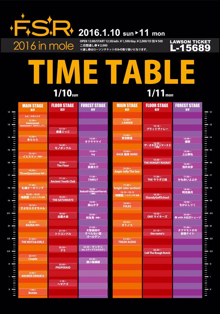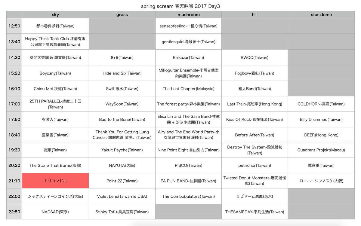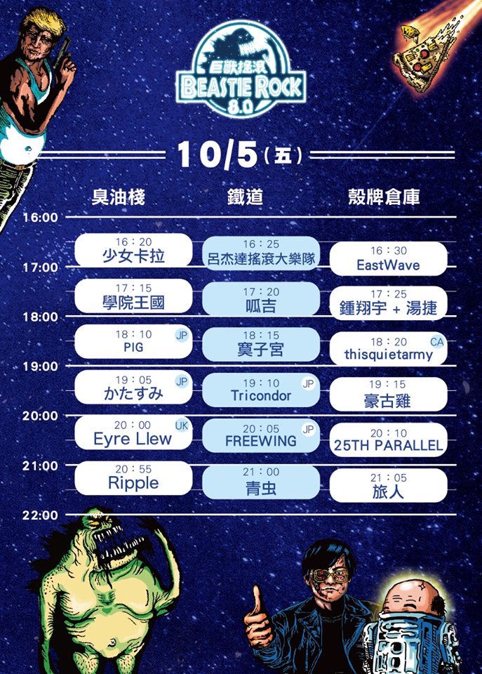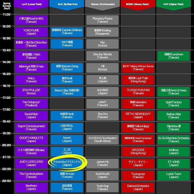 トリコンドル / Eyre Llew(England) / thisquietarmy(Canada) / かたすみ(東京) / PIG(宮崎) / FREEWING(神奈川) / 少女卡拉 siàu-lú khah-lah(Taiwan) / 呂杰達搖滾大樂隊(Taiwan) / EastWave(Taiwan) / 學院王國 College Kingdom(Taiwan) / 呱吉(Taiwan) / 鍾翔宇 Xiangyu+湯捷(Taiwan) / 寞子宮(Taiwan) / 豪古雞 SoCute (Taiwan) / 25th Parallel 緯度二十五(Taiwan) / Ripple(Taiwan) / 青虫(Taiwan) / 旅人Pilots In The Sky And On The Sea(Taiwan) /