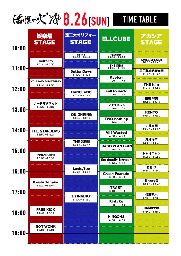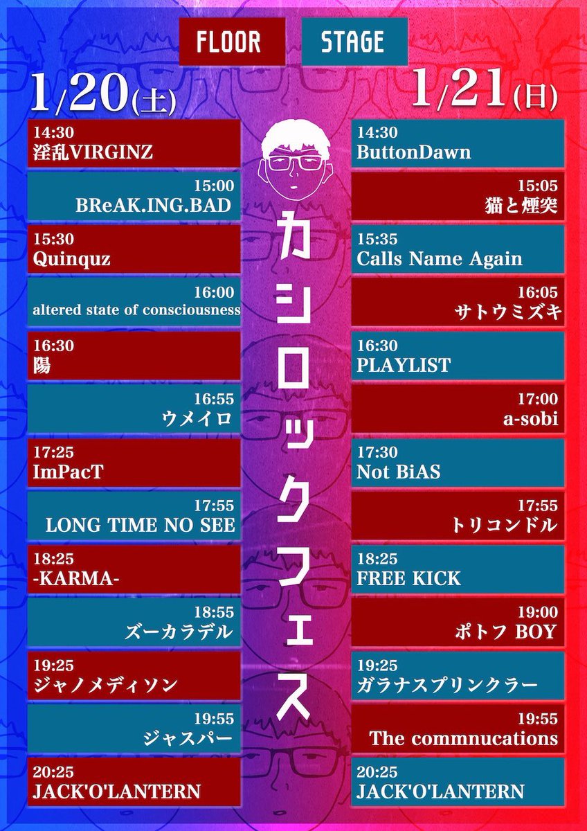 トリコンドル / FATE BOX(大阪) / The Floor / SULLIVAN's FUNCLUB / CPRNX / No.18 / さよならミオちゃん / アルクリコール / みなみ / PUSH REG LEADs / er/ca / でかくてまるい。 / クロロフィルム / NIDOMA / KOHAKU / 海とクレヨン / 復活のおにぎり / 田高健太郎 / あずまりゅーた / 久保田れな / ひなつけんた / MIllu / バンドマン大喜利 /