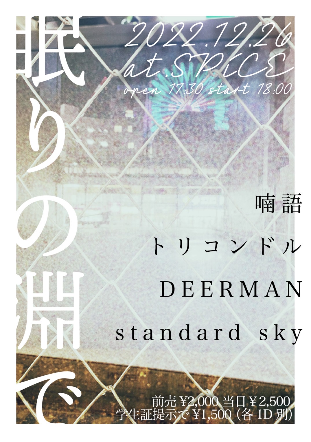 トリコンドル / あららら / UMEILO / FAQ? / KAGE稲荷BAND / CVLTE / クロロフィルム / 佐藤史帆 / さよならミオちゃん / SULLIVAN's FUN CLUB / ジャノメディゾン / Shohei & the MU.S.I.C / 道見舞美(東京) / TRiFOLiUM / なかにしりく / ノスタルジア / Force of celluloid / plums / プリメケロン / pale monster / ヤギハツマ / ゆうゆうぶらり / ワタナベシンゴ /